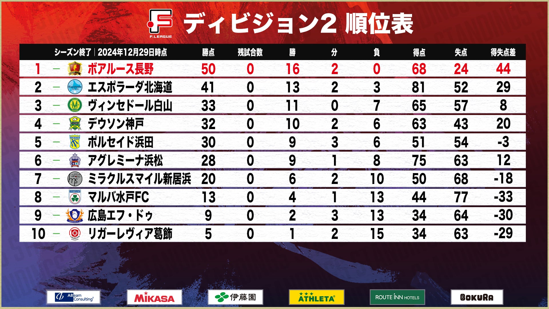 12月28日(土)〜12月29日(日)に実施したFリーグ2024-2025 ディビジョン2 最終週の3試合について結果をお知らせいたします。