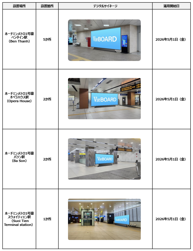 今回Vie BOARDは、ホーチミン市に対して、市内でのデジタルサイネージを活用した文化振興に関する提案を行い、2026年5月1日(金)から順次ホーチミン市内で自社保有のデジタルサイネージの運用を開始する予定です。まずは、ホーチミンメトロ駅構内の10か所にデジタルサイネージを設置し、DOOHの運用を開始します。