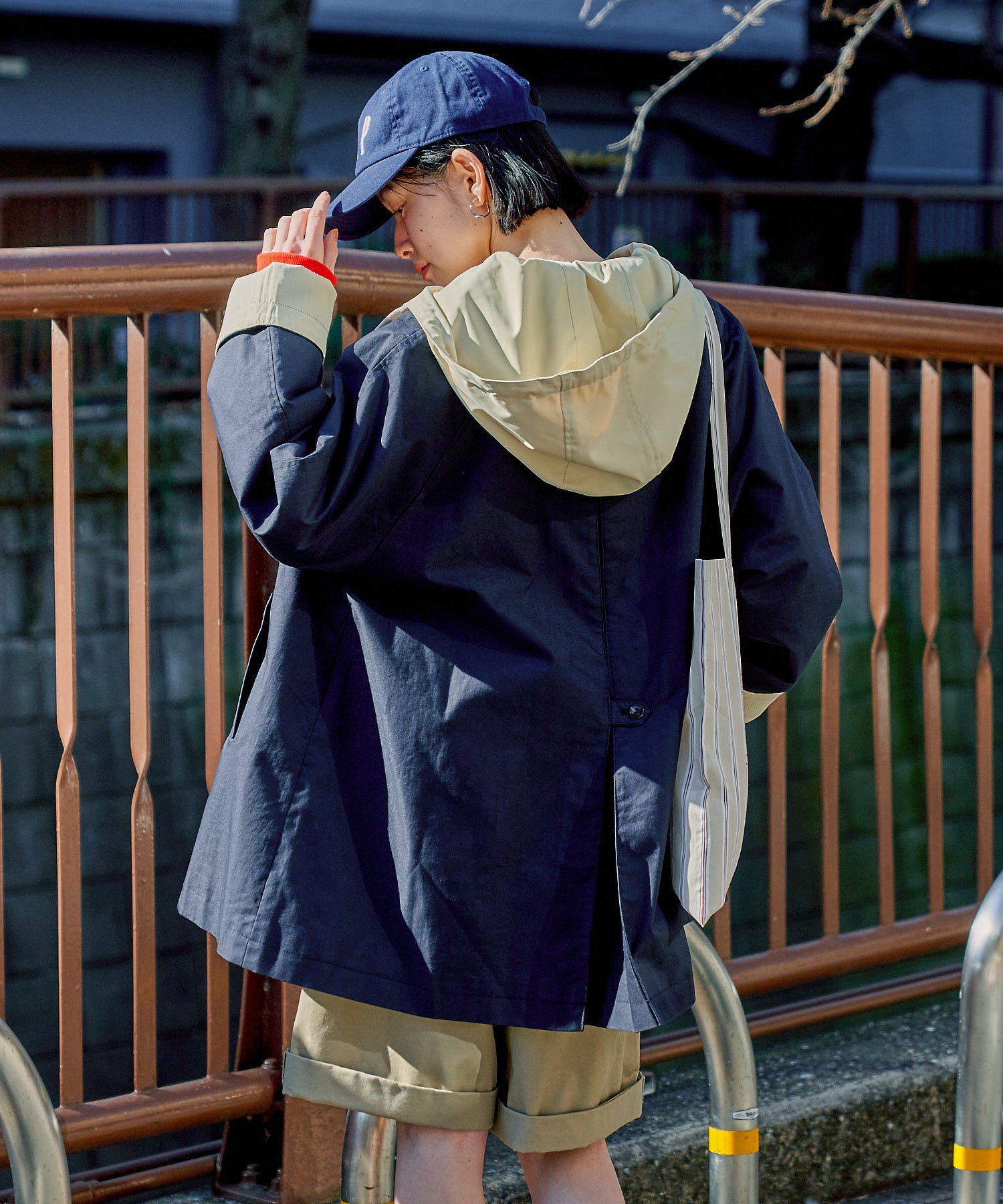ハリのある素材を使用し、立体的なシルエットが洒落感を演出するスプリングコート。フードが取り外し可能、ウエストにはドローコードを配し、着方やシルエットの変化が楽しめる一着。トレンドの配色デザインがアクセントになり、鮮度ある春のアウターコーデが完成!