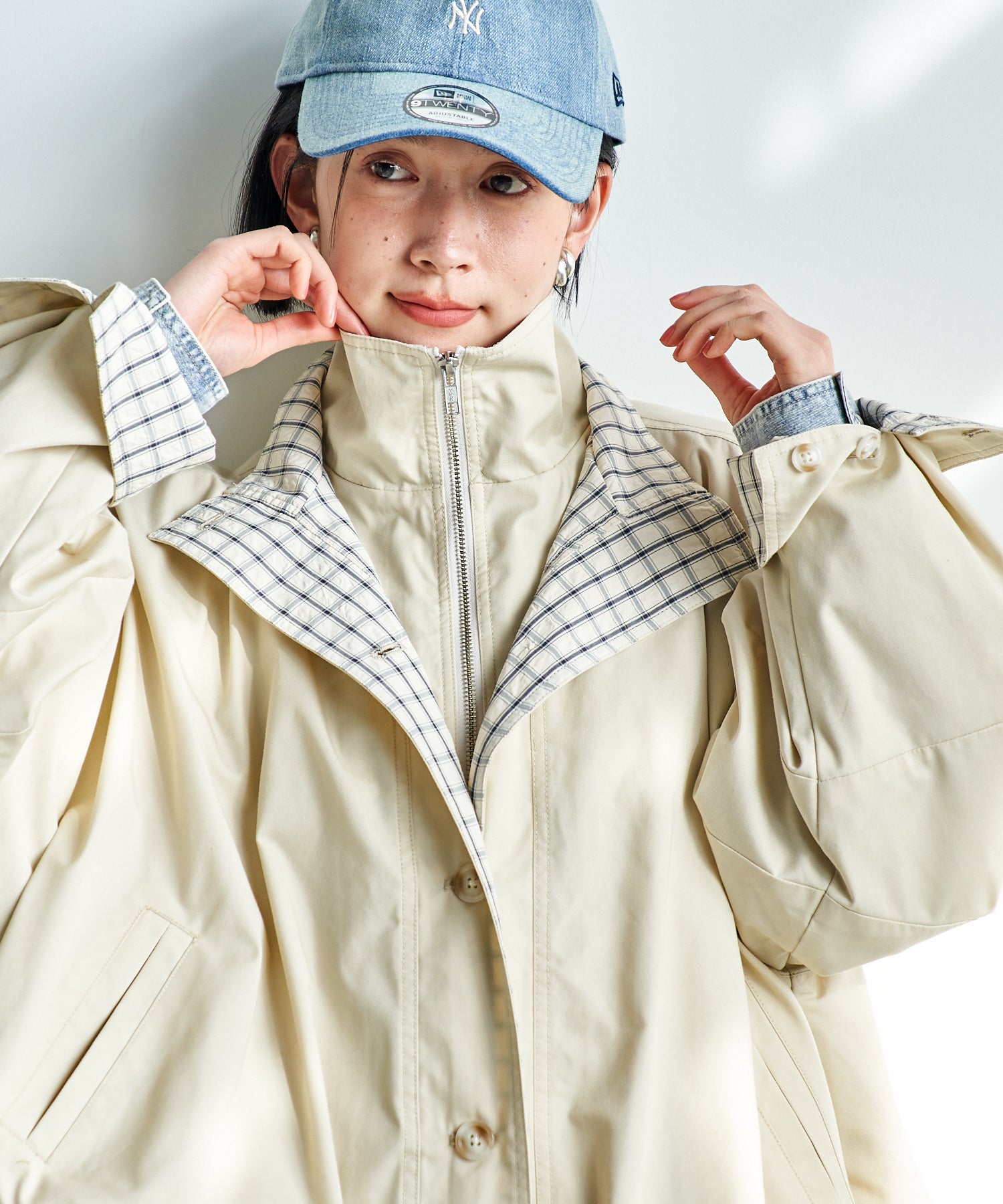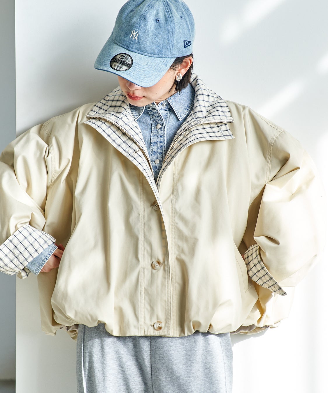 表地とチェック柄の裏衿を重ねたダブル衿仕様で、他にはないデザインの新作アウター。裾に自然な膨らみを持たせたバルーンフォルムが春らしい軽やかさを演出します。ジップ×ボタンの前立て仕様で開けても閉じても好バランス!