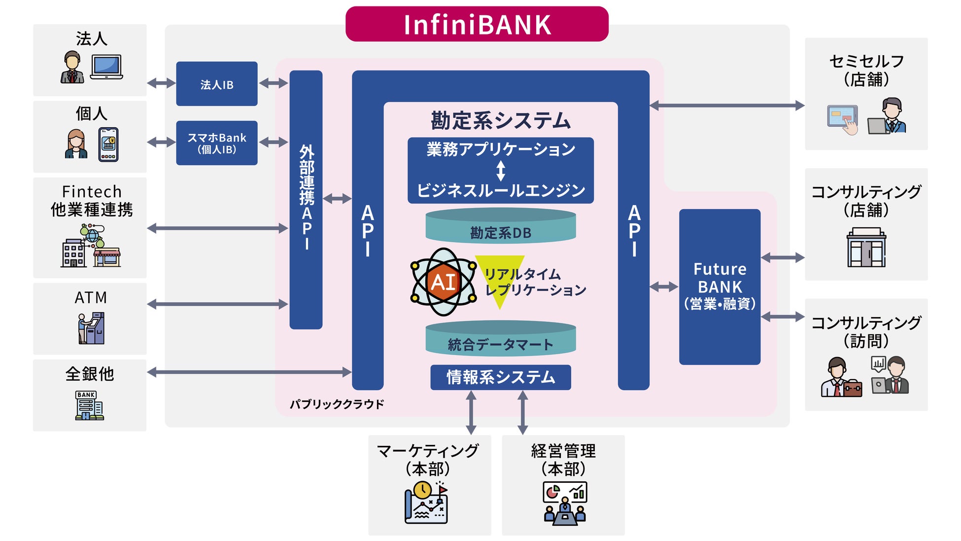 「InfiniBANK」は、AIを効果的に導入・活用するための「システム群」「業務プロセス」「業務データ」を整え、AI時代のデータ戦略とデータガバナンスを実現します。フルオープンAPI、マイクロサービスBRMS、リアルタイム統合DMを採用し、成果につながるAI-Ready(※1)な仕組みを提供します。