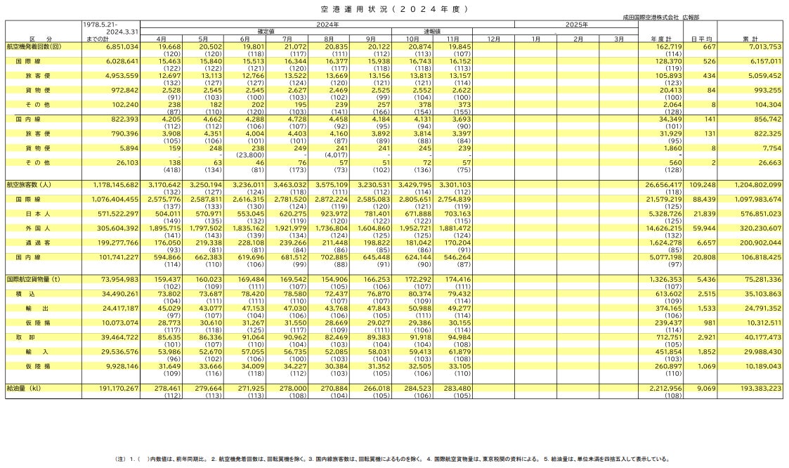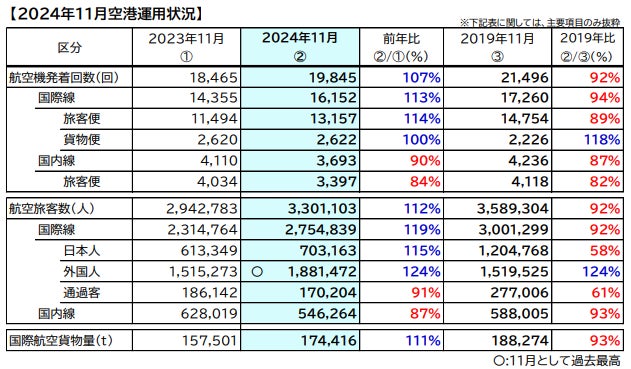 2024年11月 空港運用状況 国際線外国人旅客数が 11 月として過去最高に10 カ月連続で当該月の最高値を更新