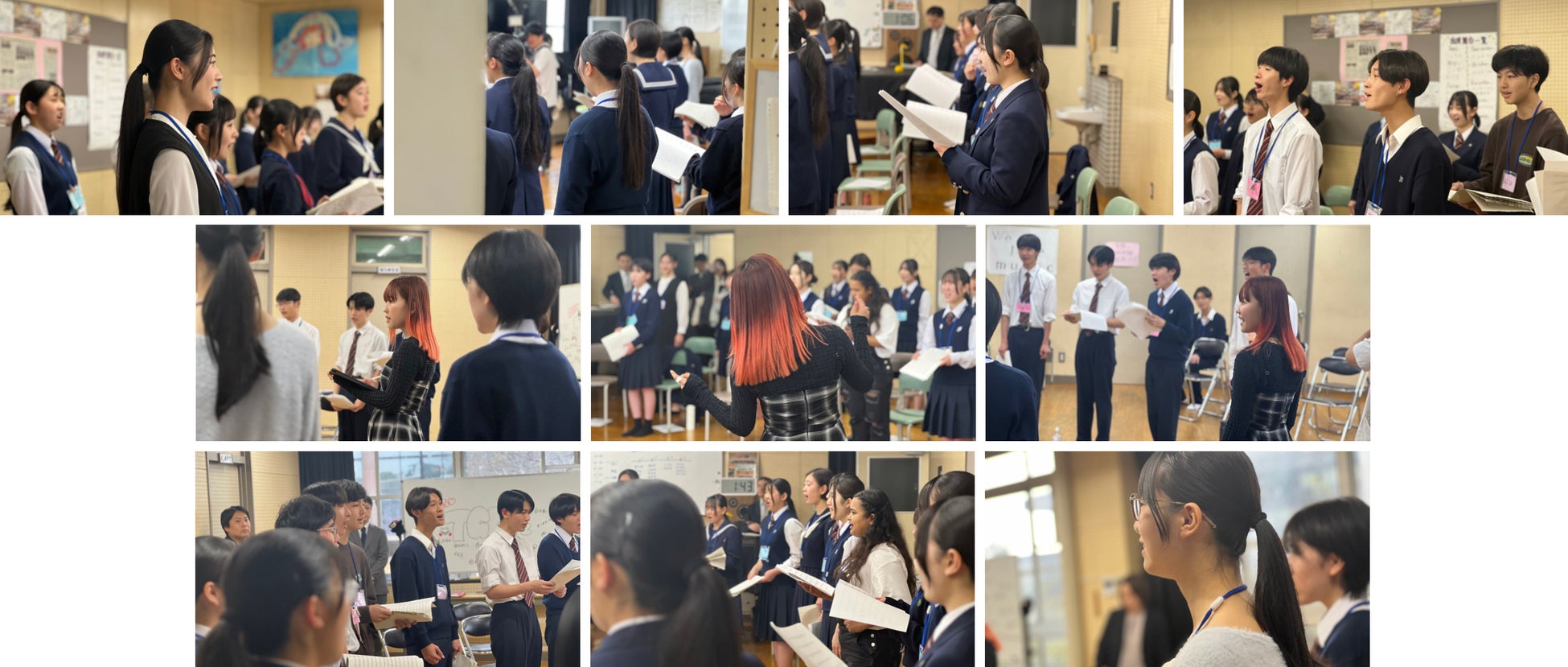 TGC熊本開催を約2週間後に控えた2025年3月28日(金)には、熊本市立必由館高等学校にて最終の合同練習会を実施しました。入り口には桜が咲き誇り、美しいピアノの音色が響き渡る午後の音楽室に集まったコーラスチームオーディション合格者、熊本市立必由館高等学校 音楽部生徒、そして麻生専門学校グループの在校生たち。初の顔合わせとは思えないほどあっという間に打ち解けた様子で、気がつくと、全員の名前と「くまモン」がデザインされたスペシャルボードも誕生!