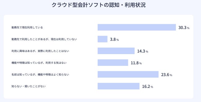 クラウド型会計ソフトの認知・利用状況については、「勤務先で現在利用している」「勤務先で利用したことがあるが、現在は利用していない」と答えた割合は34.1%という結果となりました。