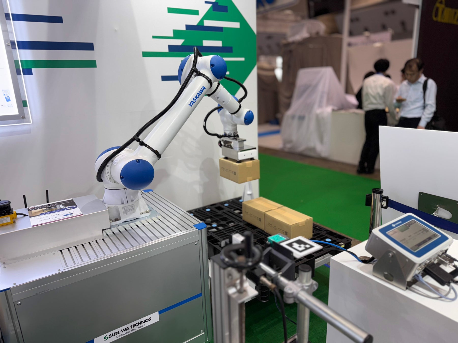 段ボール用インクジェットプリンター×ロボットは、段ボールへの直接印字、印字検査、パレタイズの各工程の自動化により、印字品質の安定と省人化に寄与することが期待できるだけでなく、標準パッケージ化によるユーザーインターフェースの向上に加え、導入コストの大幅な削減も実現した。段ボール印字にはブラザーのグループ会社であるドミノプリンティングサイエンス社製のプリンターが採用されており、ブラザーの印字技術、安川電機のロボット制御技術、サンワテクノスのシステムインテグレーション技術を併せ、人手不足、トレーサビリティの強化へ貢献していくという。