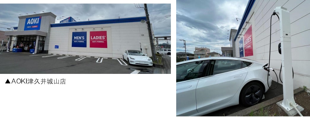 日本ではEV普及並びにEV充電器設置に力を入れています。そこで、AOKIでは経営理念の一つである「公共性の追求」のもと、脱炭素社会実現の一翼を担うべく、今回のEV充電器設置に至りました。郊外店の多いAOKIでは車利用者も多く、買い物時間も比較的長いことから、「目的地充電(施設利用中に移動時に使用した電力を継ぎ足して充電する)」に最適で、お客様の利便性向上にもつながると考えております。まずは神奈川県内の2店舗に設置し、年内には全国でもEV普及率がトップクラスの愛知県と神奈川県の11店舗への導入を予定しています。