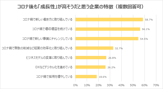 (3) コロナ後も「成長性」が高そうだと思う企業の特徴は「コロナ禍で新しい働き方に取り組んでいる」が最多