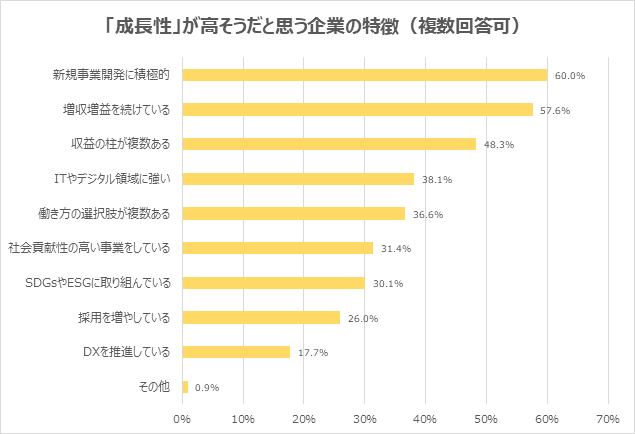 (2) 「成長性」が高そうだと思う企業の特徴は「新規事業開発に積極的」が60.0%で最多
