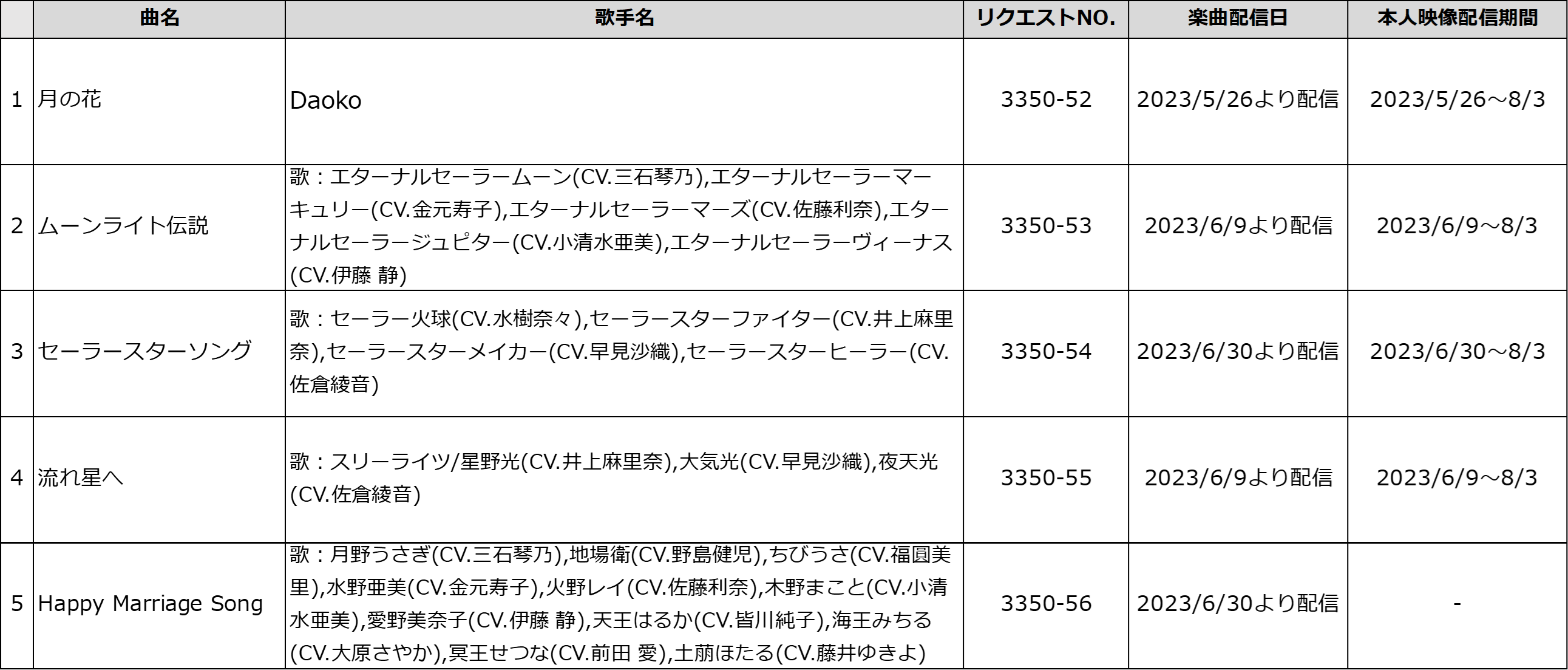 ①通信カラオケDAM に劇場版「美少女戦士セーラームーンCosmos」の主題歌の映画映像を期間限定配信*。