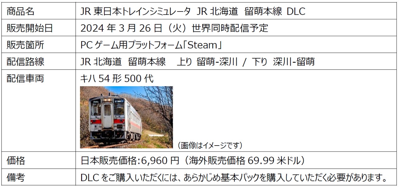 〇北海道旅客鉄道株式会社(本社:北海道札幌市中央区、代表取締役社長: 綿貫 泰之、以下「JR北海道」)、東日本旅客鉄道株式会社(本社:東京都渋谷区、代表取締役社長:深澤 祐二、以下「JR東日本」)および株式会社音楽館(本社:神奈川県川崎市、代表取締役社長: 向谷 実、以下「音楽館」)の3社は、2023年4月に廃止となった留萌本線 石狩沼田~留萌間を含む、深川~留萌間のトレインシミュレータを配信いたします。 〇PCゲーム用プラットフォーム「Steam」で配信をしている「JR東日本トレインシミュレータ(英名:JR EAST Train Simulator)」の追加ダウンロードコンテンツ(DLC)として配信いたします。 〇これまで東日本エリアの路線(山手線、総武快速線等)を配信しておりましたが、今回初めて北海道エリアの配信を行います。ぜひこの機会にお楽しみください。 |