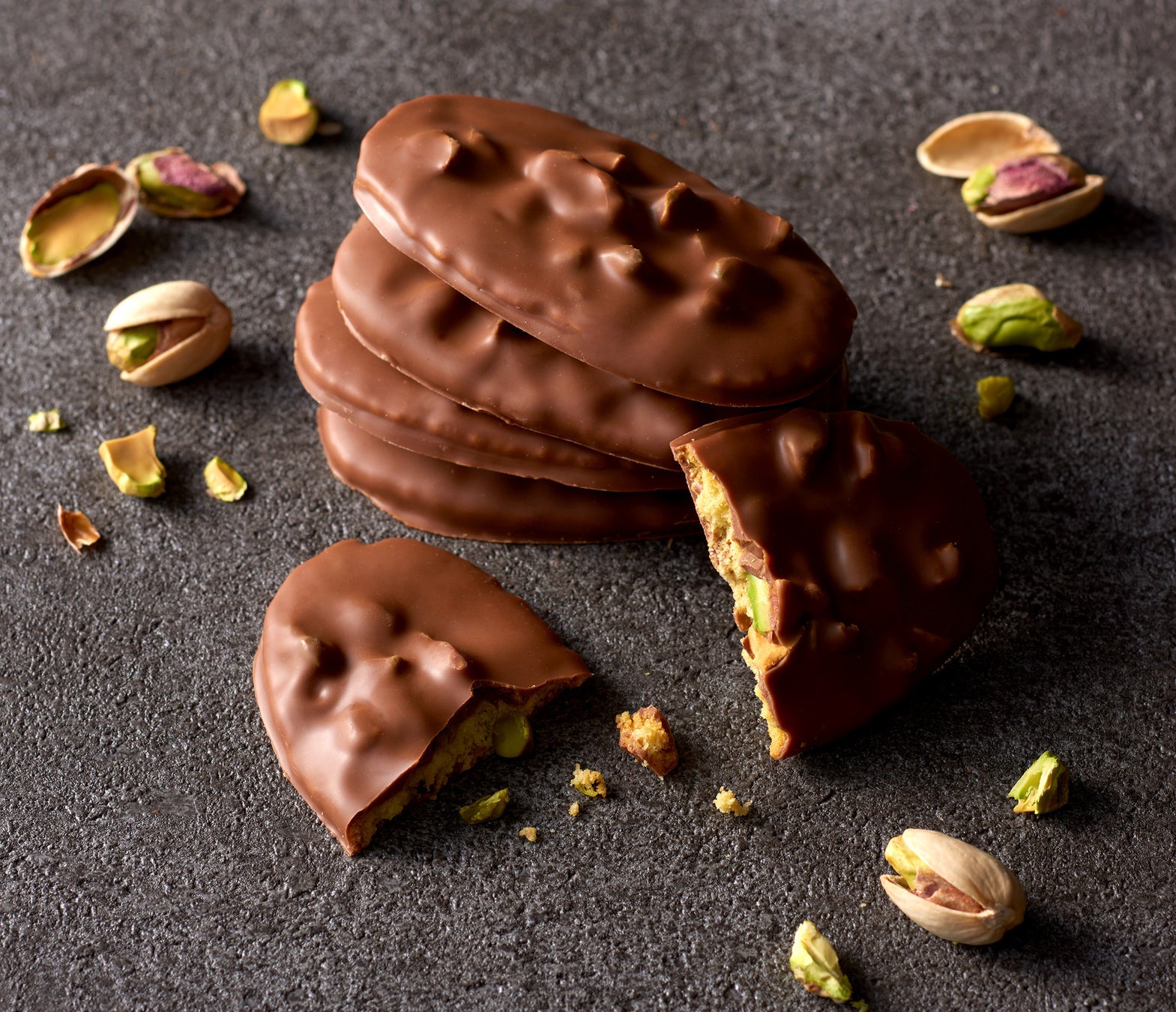 サクサクのサブレとまろやかなミルクチョコレート。ピスタチオの香ばしさが奏でるハーモニーは、マカダミア・ショコラファンにはもちろん、チョコレート好き、クッキー好き、ピスタチオ好きの方にも、きっと気に入っていただける味わいです。