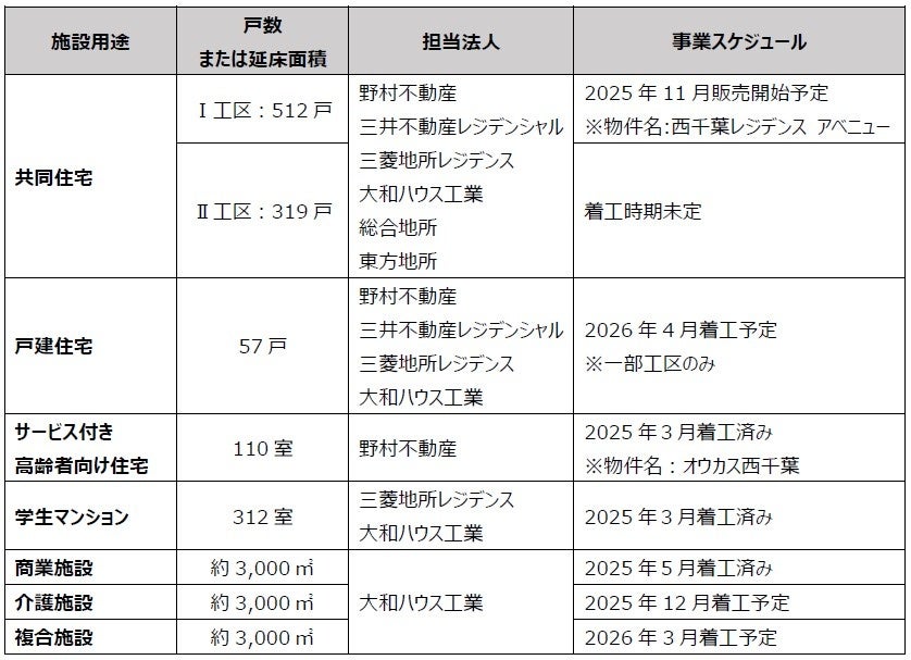 野村不動産株式会社(本社:東京都港区/代表取締役社長:松尾大作)、三井不動産レジデンシャル株式会社(本社:東京都中央区/代表取締役社長:嘉村徹)、三菱地所レジデンス株式会社(本社:東京都千代田区/代表取締役 社長執行役員:宮島正治)、大和ハウス工業株式会社(本社:大阪府大阪市/代表取締役社長:大友浩嗣)、総合地所株式会社(本社:東京都港区/代表取締役社長:梅津英司)、東方地所株式会社(本社:千葉県千葉市/取締役社長:麻生博章)の民間企業6社で構成される事業者は、国立大学法人東京大学(以下「東京大学」)が所有していた、西千葉キャンパス跡地の一部(以下「本エリア」)において、「東京大学西千葉キャンパス跡地利用協議会」によって開発事業者として選定されております。この度、跡地利用事業のプロジェクトが始動いたしましたのでお知らせします。開発地内には居心地が良く歩いて楽しいウォーカブルな空間として、隣接する千葉大学・千葉市と協議し、大学敷地・公園敷地にまたがる「(仮称)西千葉キャンパスパーク(以下「キャンパスパーク」)を整備いたします。今後、「Lifetime Academia ~一生ずっと、学べるまち。~」の事業コンセプトのもと、子どもからご年配の方まで、周辺地域も含めた多様な世代が新たな体験や出会いを通じて、「一生共に」成長していける、魅力ある文教のまちづくりを推進してまいります。