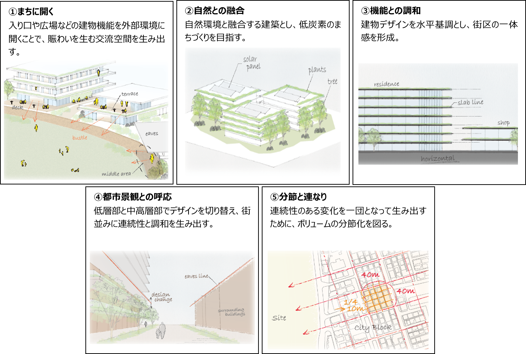 周辺地域の色彩や外構計画の一部を取り入れた5つのデザイン指針やカラーパレットを設定し、各街区の建築デザインに統一感を持たせ、一体的なまちづくりを目指します。
