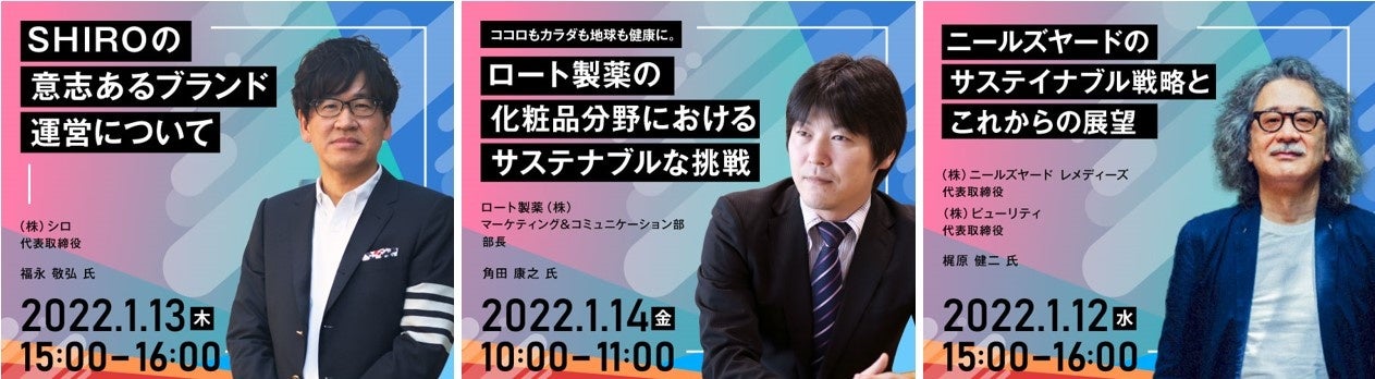 特別講演では、各化粧品メーカーから豪華講師陣が登壇。今注目のサステナブル戦略やプロダクトを原点としたブランド運営について、SHIRO、ロート製薬、ニールズヤード レメディーズから具体的事例、取り組みについて語っていただきます。