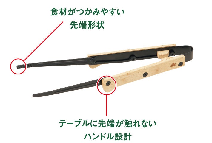 トングとしての使い方はもちろん、先端が細いため、菜箸のように食材の盛り付けや取り分けもしやすく、そのままお箸としても使用可能。ハンドル部分に突起を設けることで、テーブルに直置きしても先端がつかずに自立し、衛生面も安心。