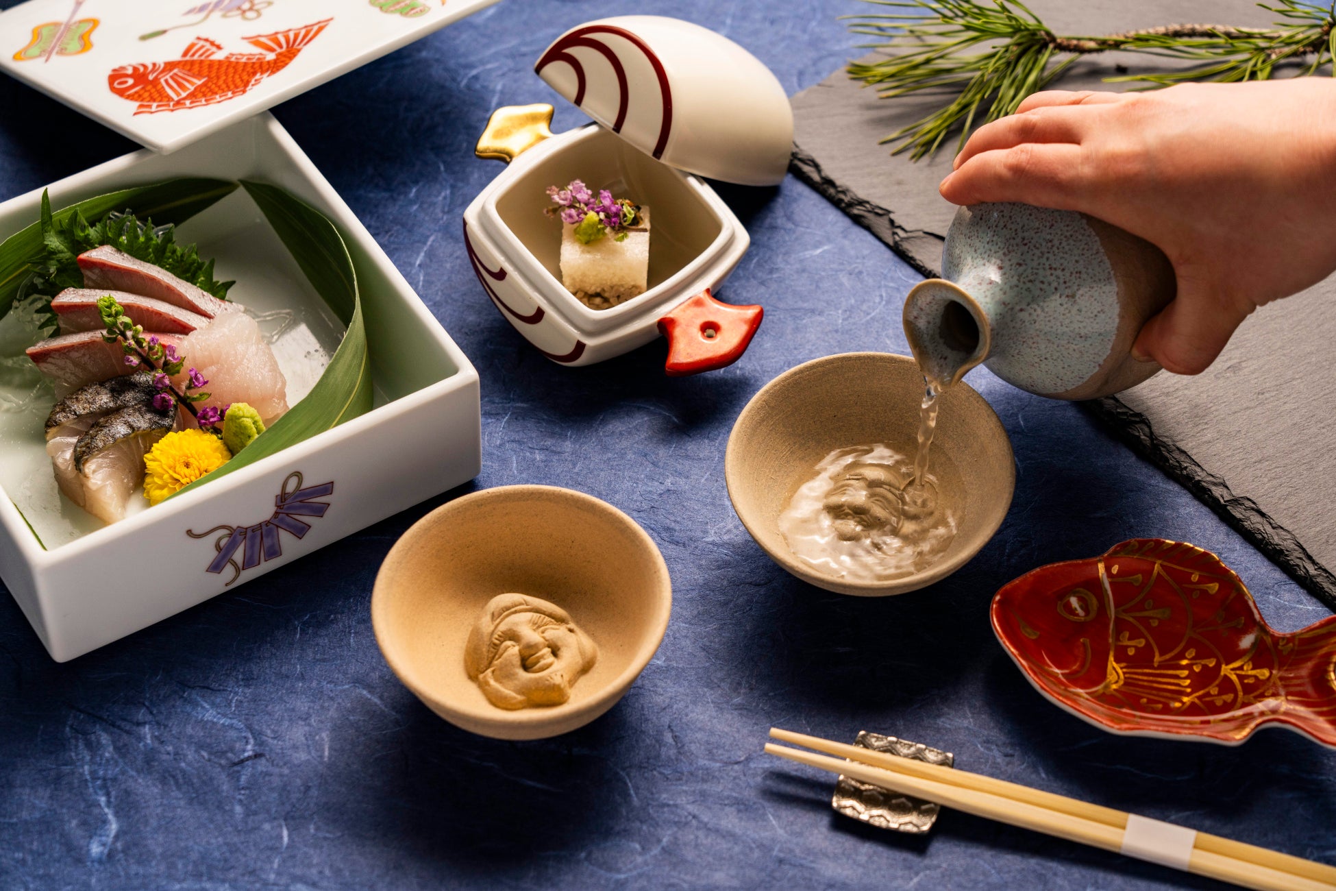 旧暦10月の「神在月」、全国から八百万の神々が集う出雲では、神様がお酒を飲みかわす「直会(なおらい)」が行われます。それに倣い、本プランでは、夕食時に出雲大社の大黒様(*1)の顔が盃の底に掘られた石州瓦のオリジナルの神楽盃で出雲の地酒を提供します。