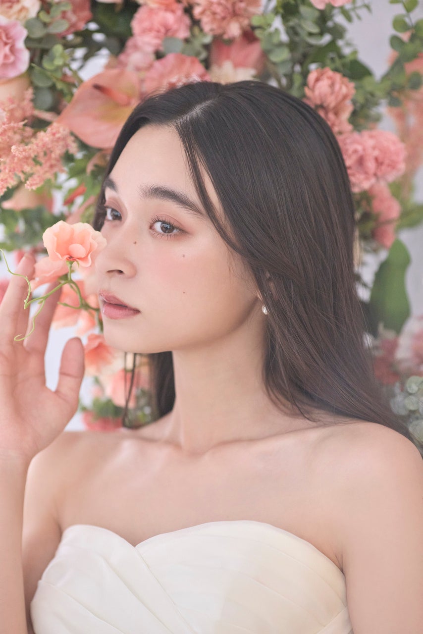 メイクは、お花の色味に合わせたコーラルピンクカラーをメインに使用。ヘアはゆるめに巻いたダウンスタイルで、作り込みすぎない抜け感を。