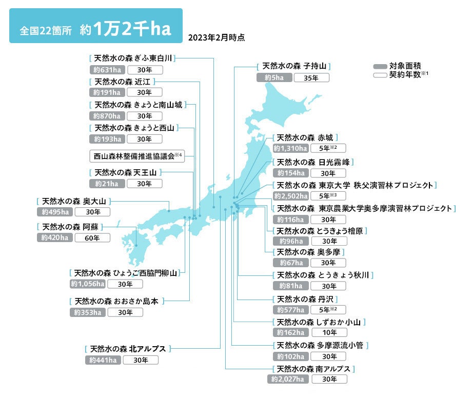 これにより、水源涵養活動である「サントリー 天然水の森」は、全国15都府県において、22ヵ所(約1万2千ha)まで拡大しました。