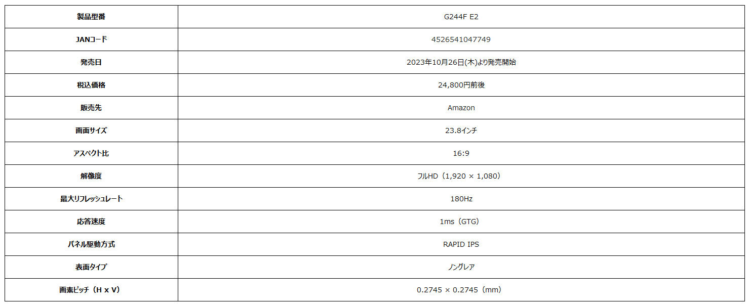 さらに、コストパフォーマンスに優れた『G』シリーズより、プロも愛用する丁度良いサイズ感の23.8インチフルHD(1,920 × 1,080)解像度、高速描写と高画質を両立したRAPID IPSパネル、リフレッシュレート180Hz、応答速度1ms(GTG)の高いスペックを備えたゲーミングモニター「G244F E2」が新たにラインナップに加わります。