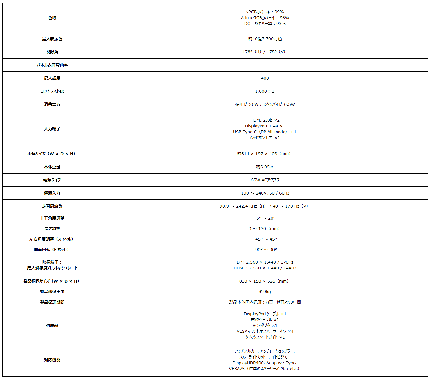 「G274QPF」はフルHDの約1.8倍の情報量で高精細な表示が可能なWQHD(2,560 × 1,440)解像度、高画質と高速応答を実現したRAPID IPSパネルを採用しており、一般的144Hzのゲーミングモニターと比べ26フレームも高速なリフレッシュレート170Hz(オーバークロック設定)、応答速度1ms(GTG)の高いスペックを誇り、残像感の少ない映像で快適にゲームプレイを楽しむことができます。さらに、リアルな映像を表現可能なDisplayHDR 400、同期機能としてAdaptive-Sync、暗いシーンでも視認性を上げるナイトビジョン搭載で高精細かつ高画質な映像でより快適にゲームを楽しみたい方にお勧めなゲーミングモニターです。また、エルゴノミクスデザインを採用したスタンド機能で無理のないポジションで使用することができるほか、長時間の使用において目の疲労を軽減するアンチフリッカー、ブルーライトカット機能を搭載し、Adobe RGBカバー率:96%、DCI-P3カバー率:93%と広色域表示に対応、1台でゲーミング・クリエイター用途にご使用可能なハイスペックモデルです。入力端子はHDMI 2.0b ×2、DisplayPort 1.4a ×1、USB Type-C(DP Alt mode)×1に対応しており、PCとゲーム機など複数の機器を接続する事が可能です。背面のジョイスティックを操作することで簡単に入力切り替えやメニュー操作を行うことができます。VESA規格にも対応しており、付属のスペーサーネジを使用する事でモニターアームに取り付ける事が可能です。
