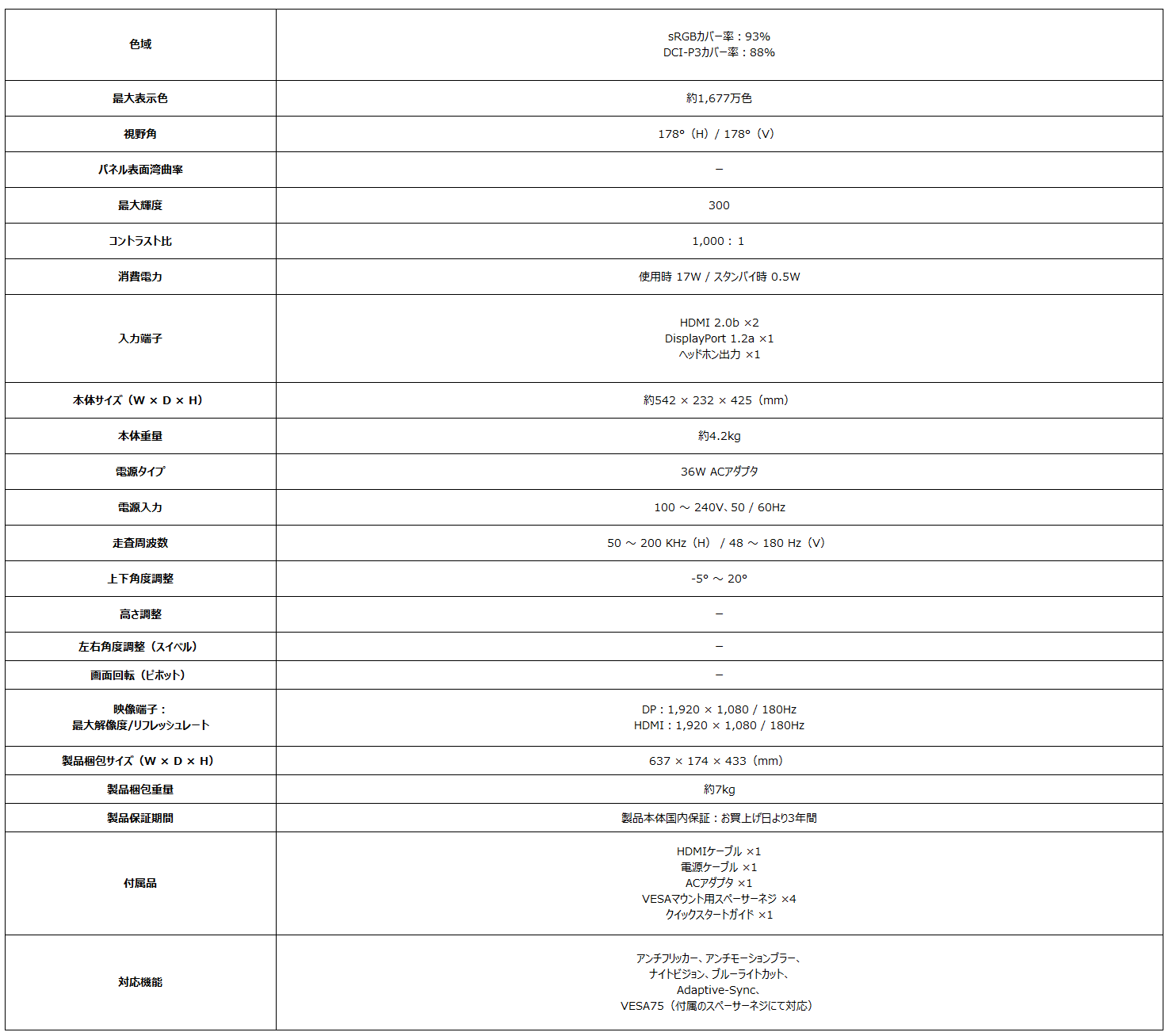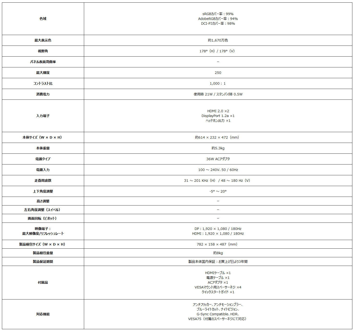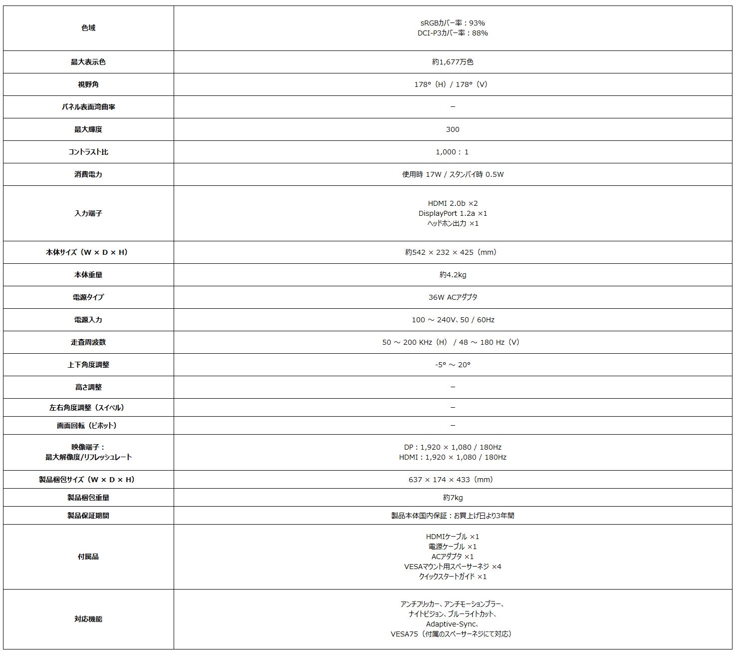 「G274F」は27インチのフルHD解像度、高画質と高速応答を実現したRAPID IPSパネルを採用しており、一般的な144Hzのゲーミングモニターと比べて36フレームも高速なリフレッシュレート180Hz、応答速度1ms(GTG)の高いスペックを誇り、残像感の少ない映像で快適にゲームプレイを楽しむことができます。さらに、リアルな映像を表現可能なHDR、同期機能としてG-SYNC Compatible、暗いシーンでも視認性を上げるナイトビジョン搭載で高画質な映像でより快適にゲームを楽しみたい方にお勧めなゲーミングモニターです。長時間の使用において目の疲労を軽減するアンチフリッカー、ブルーライトカット機能を搭載し、Adobe RGBカバー率:94%、DCI-P3カバー率:98%と広色域表示に対応、1台でゲーミング・クリエイター用途にご使用可能なハイスペックモデルです。入力端子はHDMI 2.0 ×2、DisplayPort 1.2a ×1、に対応しており、PCとゲーム機など複数の機器を接続する事が可能です。背面のジョイスティックを操作することで簡単に入力切り替えやメニュー操作を行うことができます。VESA規格にも対応しており、付属のスペーサーネジを使用する事でモニターアームに取り付ける事が可能です。