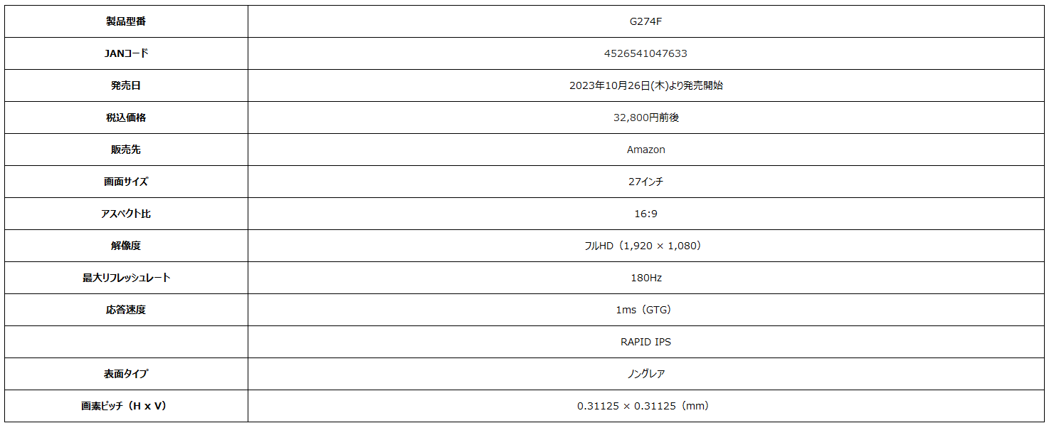 また、コストパフォーマンスに優れた『G』シリーズより、27インチフルHD(1,920 × 1,080)解像度、高速描写と高画質を両立したRAPID IPSパネル、リフレッシュレート180Hz、応答速度1ms(GTG)、クリエイター向けの広色域をカバーしたゲーミングモニター「G274F」が新たにラインナップに加わります。