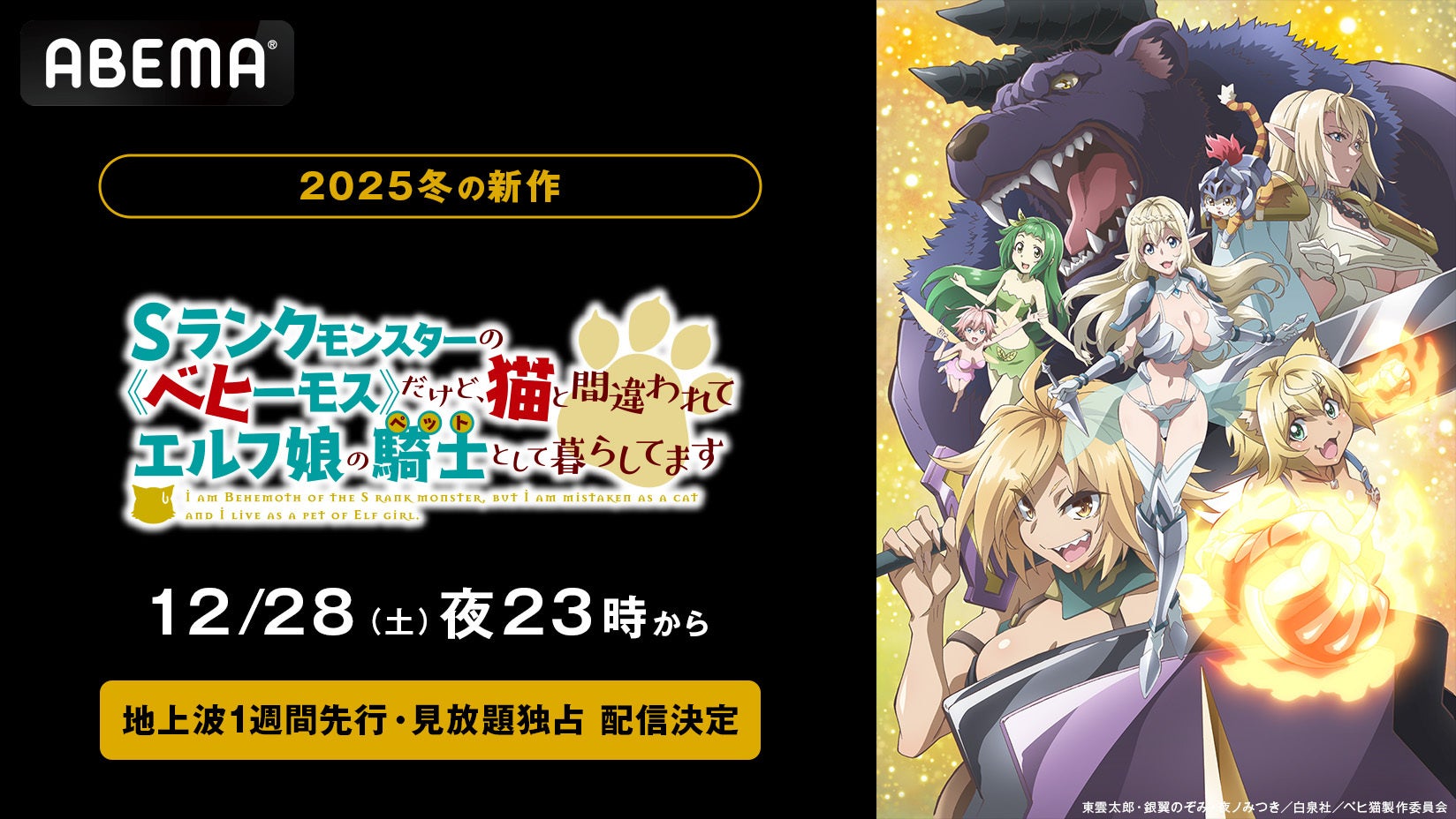 新しい未来のテレビ「ABEMA」は、2025年新作冬アニメ『Sランクモンスターの《ベヒーモス》だけど、 猫と間違われてエルフ娘の騎士(ペット) として暮らしてます』を、2024年12月28日(土)夜11時より地上波1週間先行・見放題独占配信いたします。