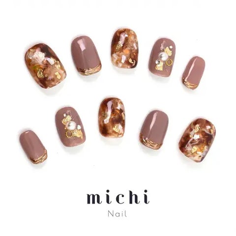 深みのあるブラウンを基調に、マーブル模様と金箔を組み合わせて天然石のような輝きを表現。シックなモーヴピンクのワンカラーにはゴールドのニュアンスアートとパールを添え、上品さと華やかさを両立した大人の気品溢れるネイルです。