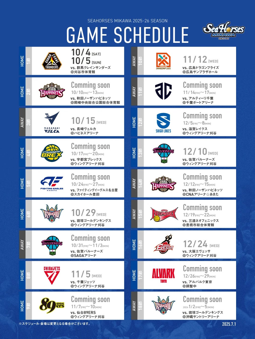シーホース三河の開幕戦は10月4日(土),5日(日)のホーム・群馬クレインサンダーズ戦となります。