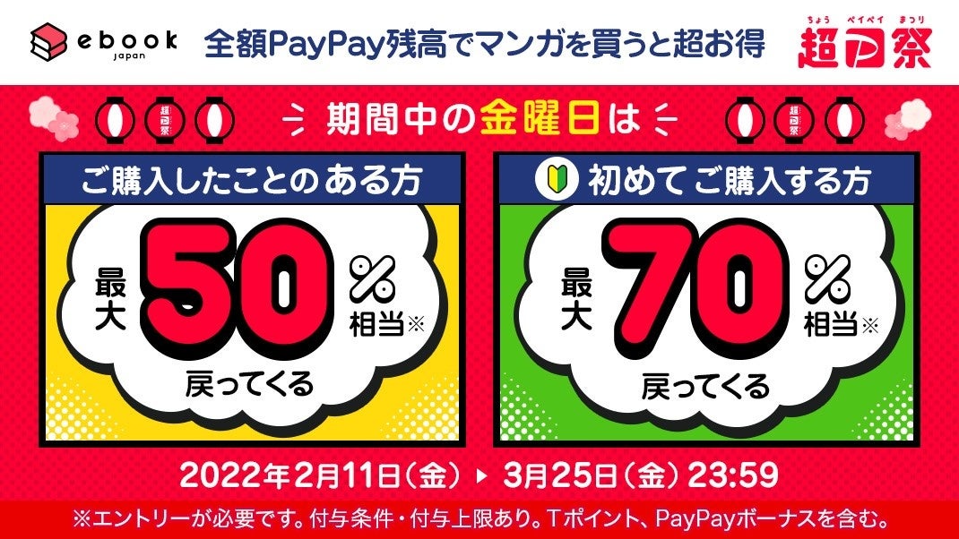 電子書籍販売サイト「ebookjapan」をヤフー株式会社と協力して運営する、株式会社イーブックイニシアティブジャパン(本社:東京都千代田区、代表取締役社長:高橋将峰(たかはしまさみね))は、ebookjapanで「PayPay残高」を使って電子書籍を購入すると、決済金額に対して最大70%相当のPayPayボーナスを付与する「超PayPay祭 ebookjapanでお得キャンペーン」、「超PayPay祭 初めてのお客様はebookjapanで毎日お得キャンペーン」を、2022年2月11日(金)から2022年3月25日(金)まで実施します。