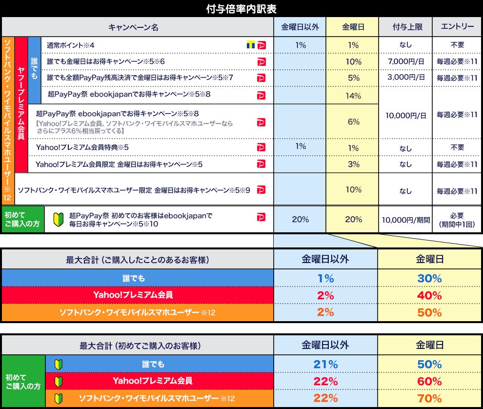 ※8 「超PayPay祭 ebookjapanでお得キャンペーン」のPayPayボーナスの付与上限は、開催日ごとに1日あたり10,000円相当です。Yahoo!プレミアム会員、ソフトバンク・ワイモバイルスマホユーザーは20%相当、それ以外の方は14%相当のPayPayボーナスが戻ってきます。