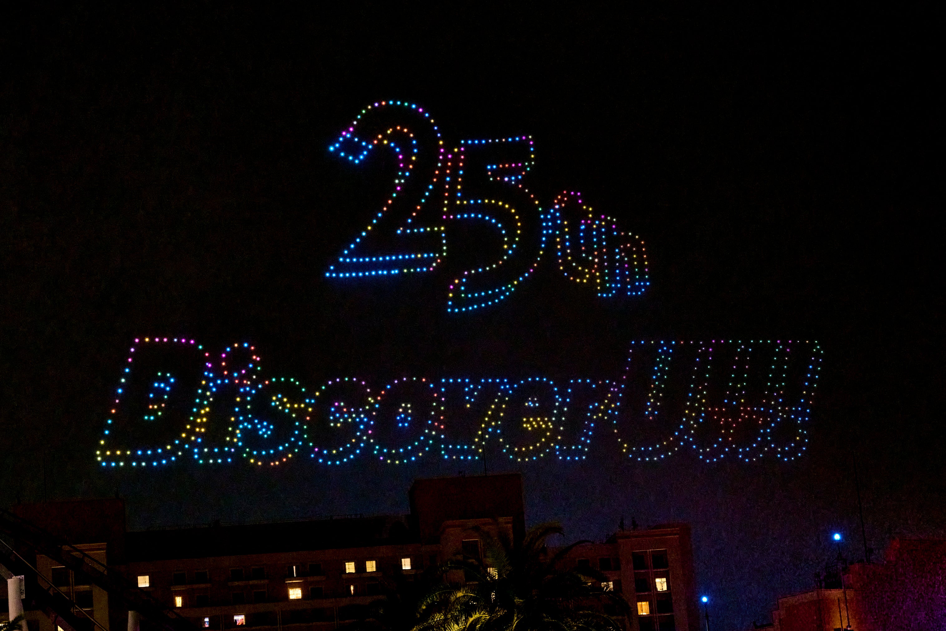 パーク史上初となるドローンショーでは、笑顔で手を振るウッディー・ウッドペッカーとウィニー・ウッドペッカーが描きだされ、まるで25周年をともに祝ってくれたゲストの皆さまへ、感謝のメッセージを届けているかのように輝きました