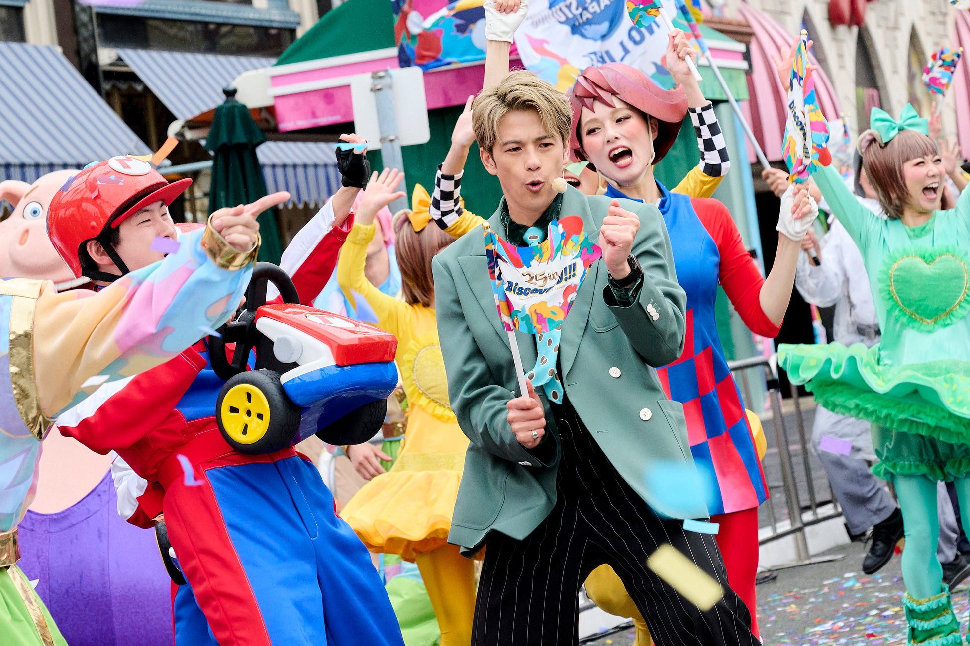 セレモニーのクライマックスでは、登壇の皆さま、沿道のゲスト、そしてエンターテイナーとパークの人気者たちが、パレードの超熱狂ダンスタイム“超 Discover U!!! ”タイムで大はしゃぎのお祭り騒ぎ!カラフルな紙吹雪が舞うなか、感情を解放して25周年の幕開けを宣言!超興奮のアニバーサリー・イヤーが明日からスタートします。