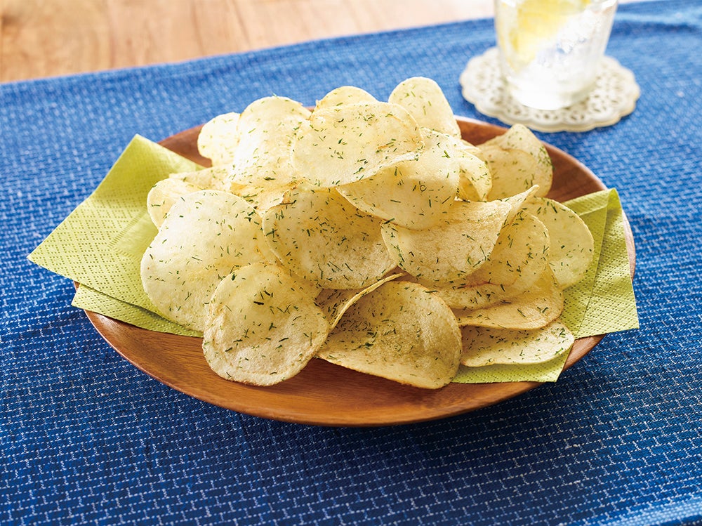 「ポテトチップス(琉球あおのり)」は原材料にじゃがいも、植物油、塩、スジアオノリだけを使用しました。ポテトチップのサクサクとした食感とともに、口の中で広がる青のりの香りと豊かな風味が味わえます。