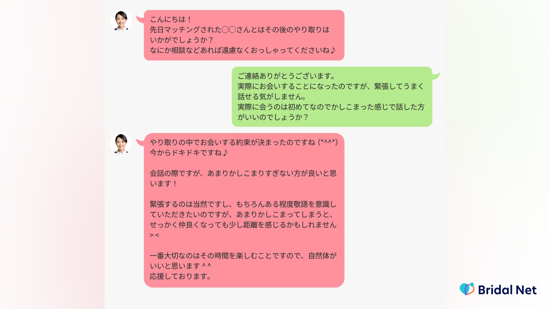 婚活者の中には、「バレンタインデー付近にお会いする際に、女性からお菓子を渡した方がいいのか悩みます。また渡した後のやりとりが中々続かないです(30代女性)」といったお悩みの声もあり、そのような声に対し、ブライダルネットでは婚活のプロ(=婚シェル)によるメッセージサポートを提供しています。