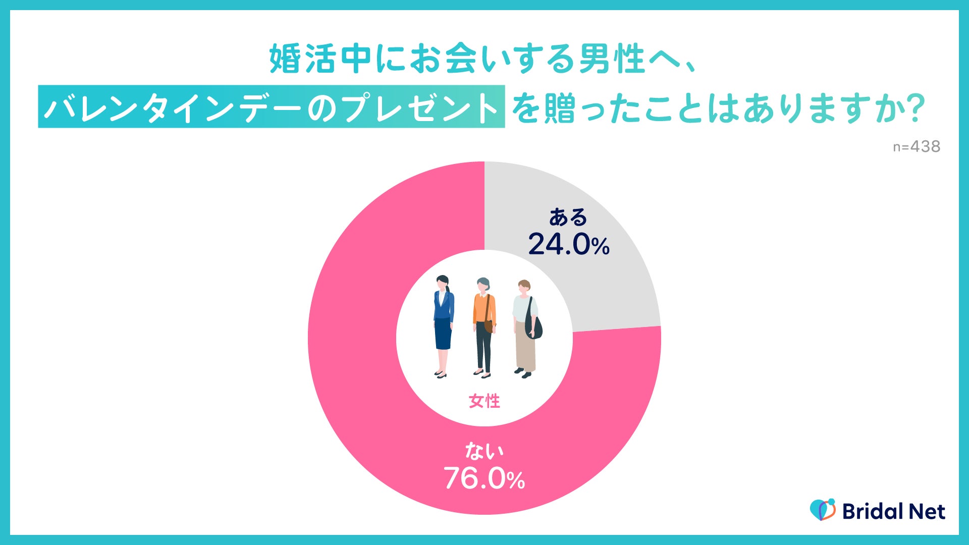 「婚活中にバレンタインのプレゼントを贈ったことがあるか」調査したところ、「ある」と回答した女性は24.0%と、約8割はバレンタインデーを恋愛イベントとして活用していないことがわかりました。