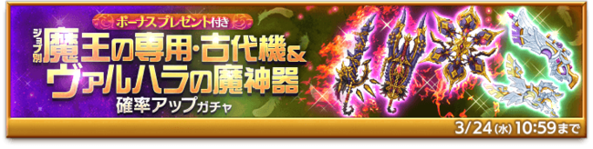 期間中、「ジョブ別 魔王の専用・古代機&ヴァルハラの魔神器確率アップガチャ」を販売します。