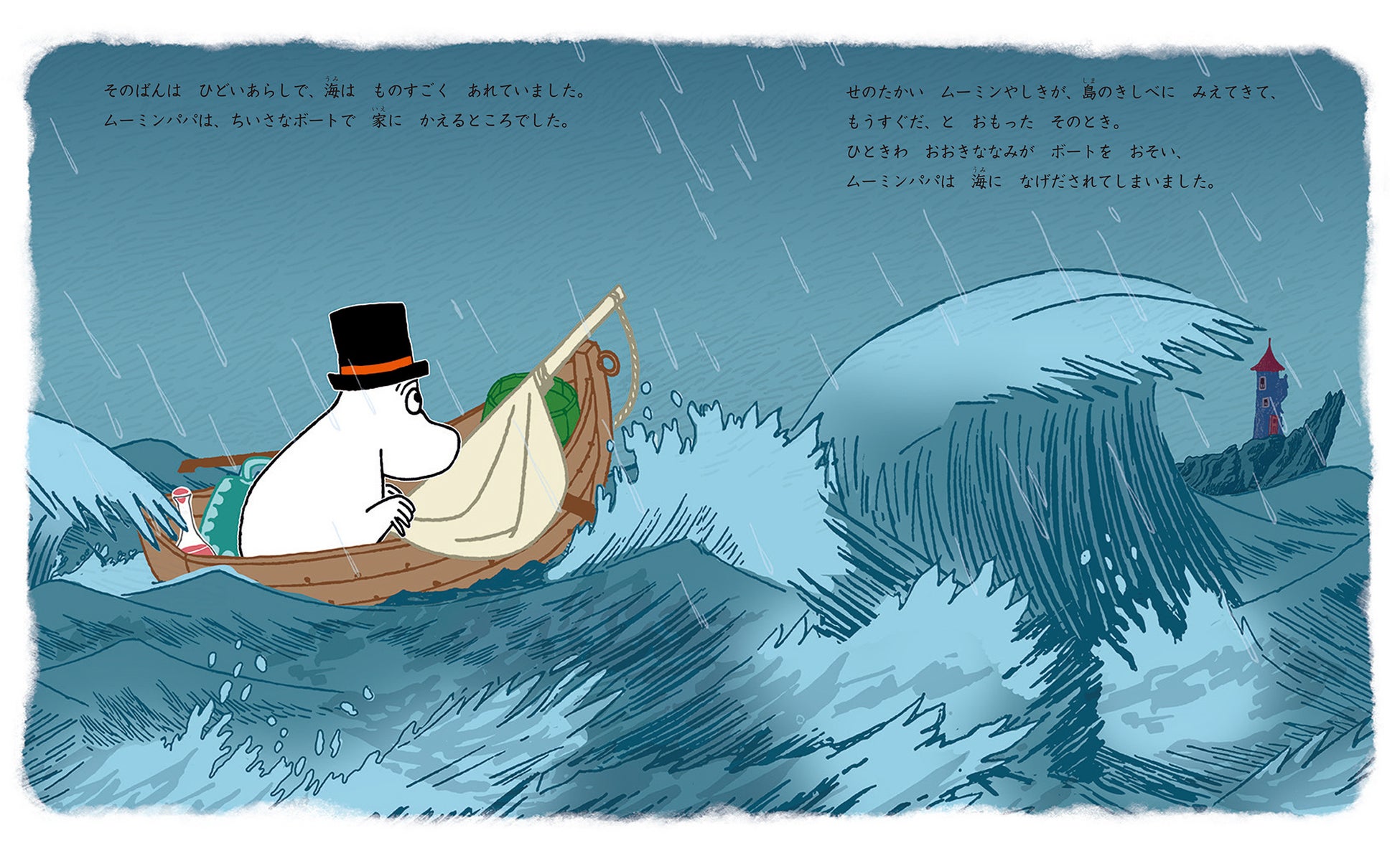 ムーミンパパが建てたムーミンやしき。さいしょは森の奥で作られ、船の上に移され、さらに島の岸辺に…と、ムーミンやしきは、場所を移していたのです。そのうえ、嵐で、島の岸辺から流されてしまい、ムーミンパパは、ムーミンママやムーミントロールとはなればなれになってしまいます…。