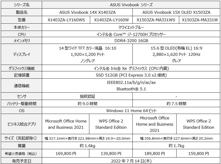 ASUS JAPAN株式会社は、カジュアルで親しみやすいデザインの「ASUS Vivobook」シリーズに、圧倒的なパフォーマンスを発揮する第12世代インテル®Core™Hシリーズプロセッサーを搭載した薄型でパワフルかつスタイリッシュな14型ノートパソコン「ASUS Vivobook 14X X1403ZA」と15.6型ノートパソコン「ASUS Vivobook 15X OLED X1503ZA」を発表いたしました。本日よりオフィシャルオンラインストアASUS Storeにて限定販売開始いたします。