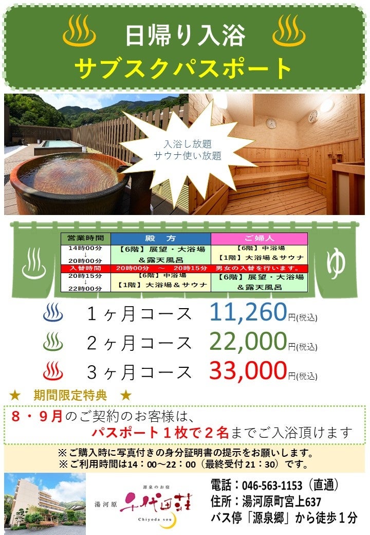 グループ会社である、湯河原千代田荘では、日帰り入浴のサブスクを販売中。