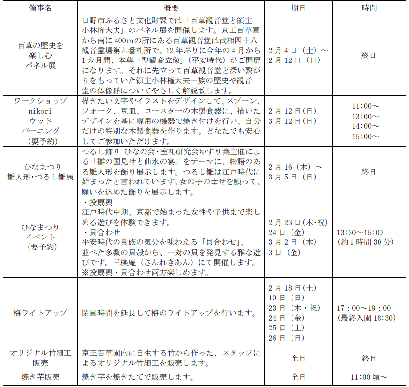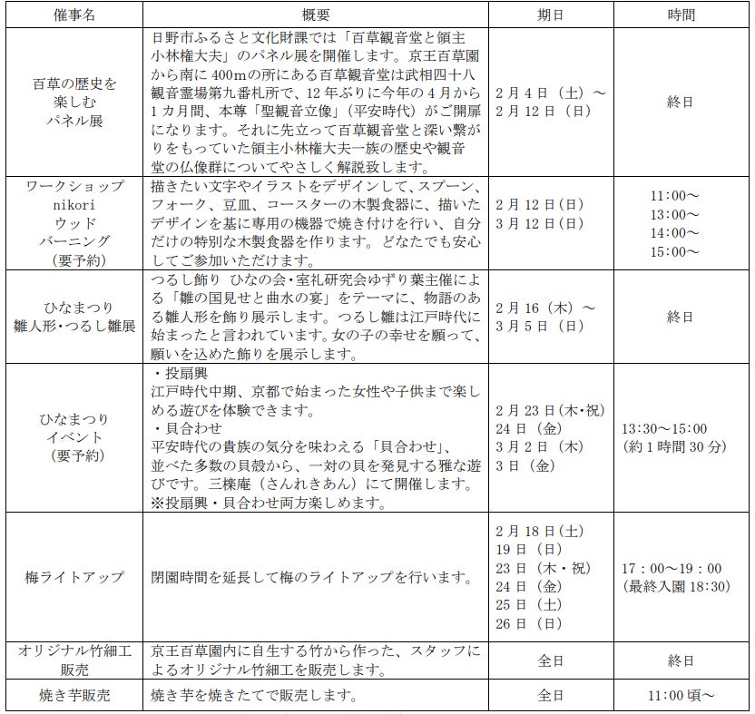 その他、京王自動車株式会社(本社:東京都多摩市、取締役社長:髙木 保)の京王タクシーを利用してご来園されたお客さまには「京王百草園手作りの梅干し」をプレゼントするほか、「焼き芋」や京王百草園内に自生する竹からスタッフが手作りした「竹細工」の販売も行います。