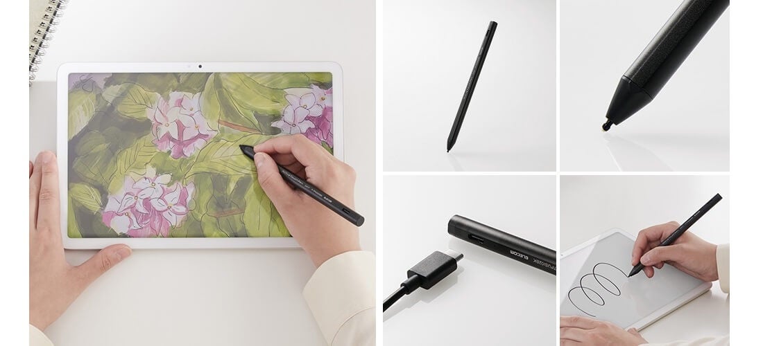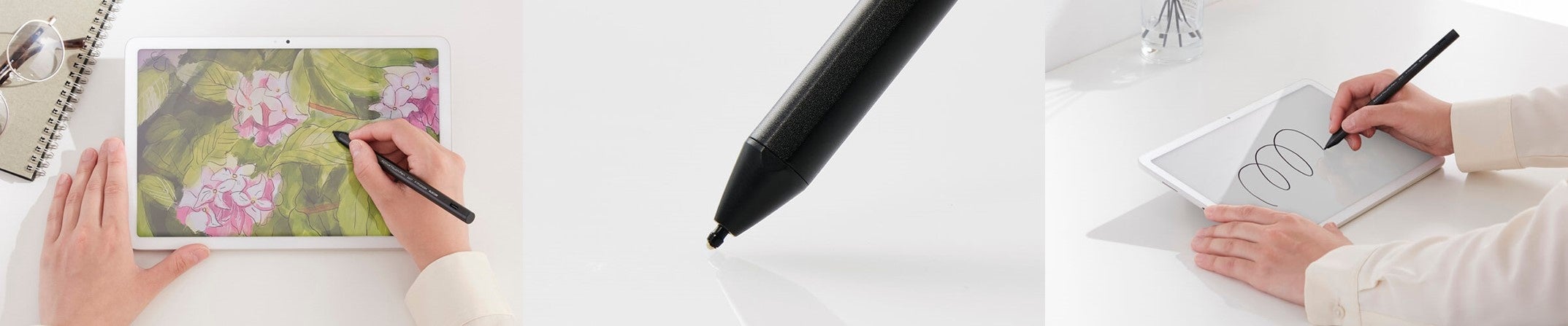USI(Universal Stylus Initiative)規格に対応した、電池交換不要の充電式アクティブタッチペンです。約1.3mmの極細ペン先と4,096段階の筆圧感知機能を備えています。さらに、手のひらが画面に触れても誤動作が起こらないパームリジェクション機能を搭載しているので、ペンで紙に文字やイラストを描くような感覚で操作できます。