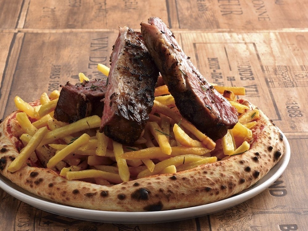 ポークスペアリブとフライドポテトを山盛りトッピングした豪快なピッツァ