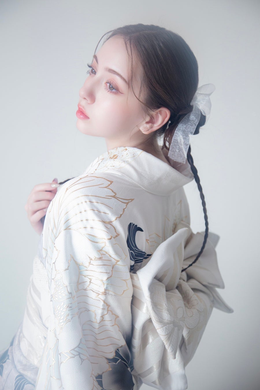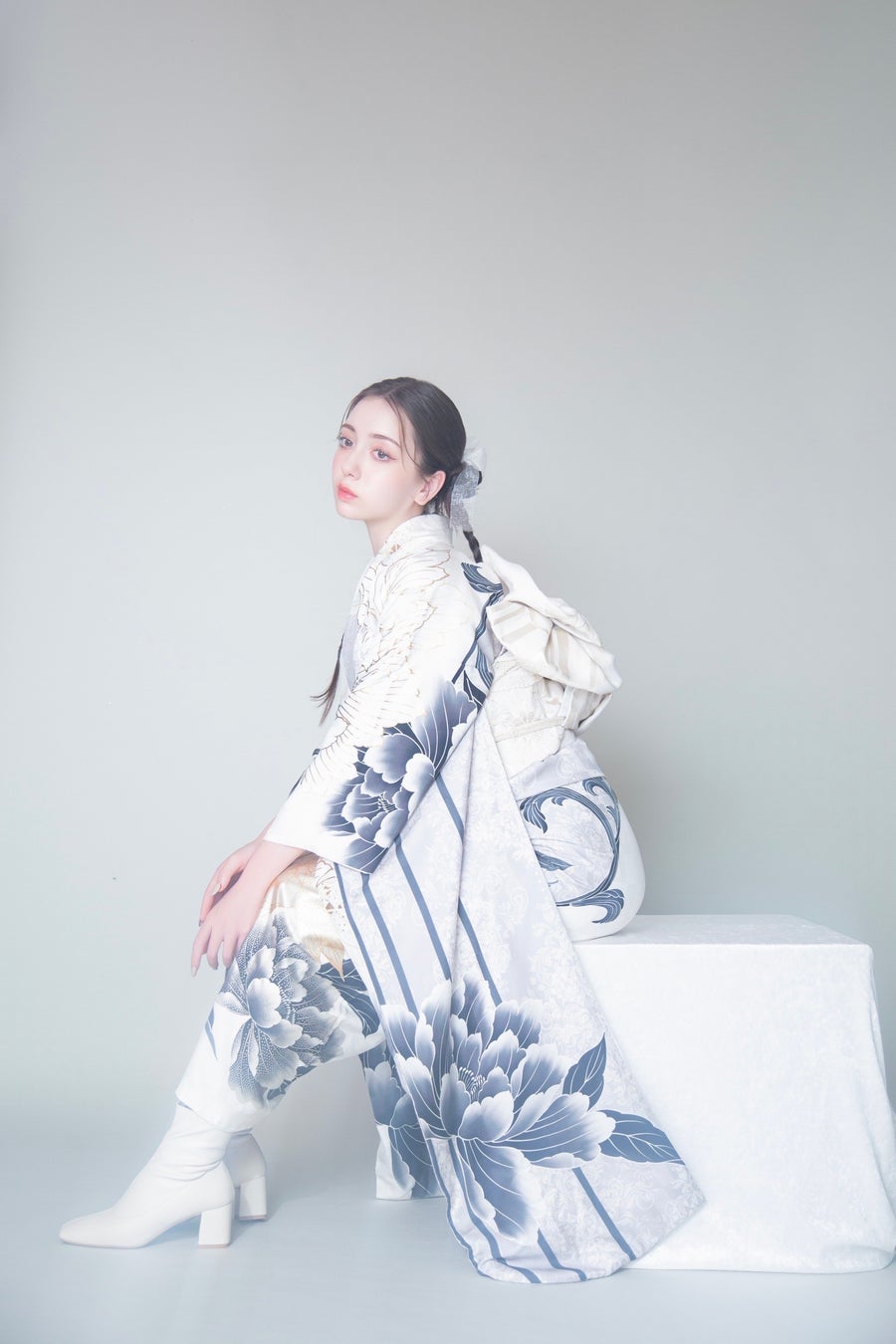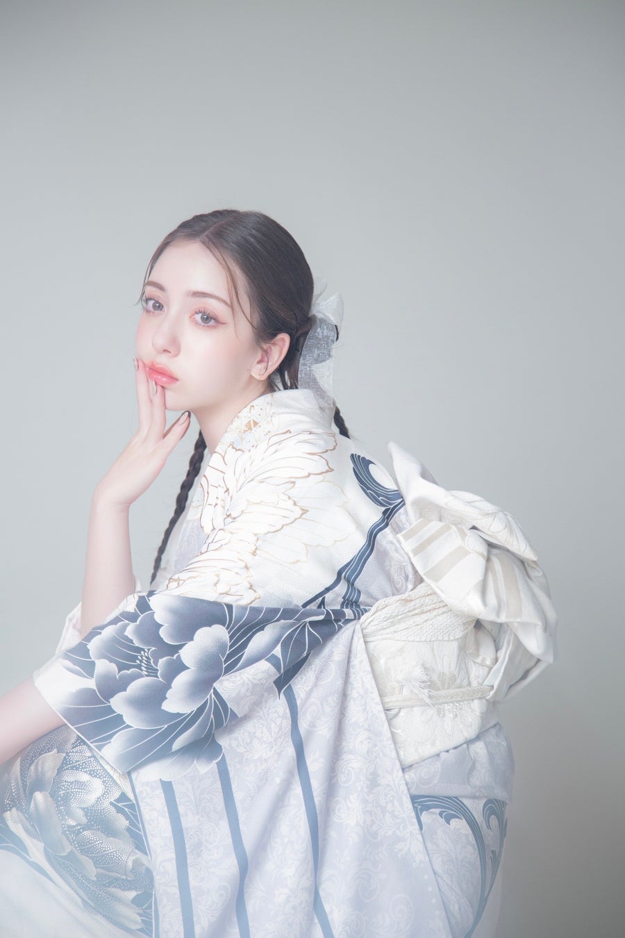 淡いグレーペーパー背景が、白の振袖引き立たせ、