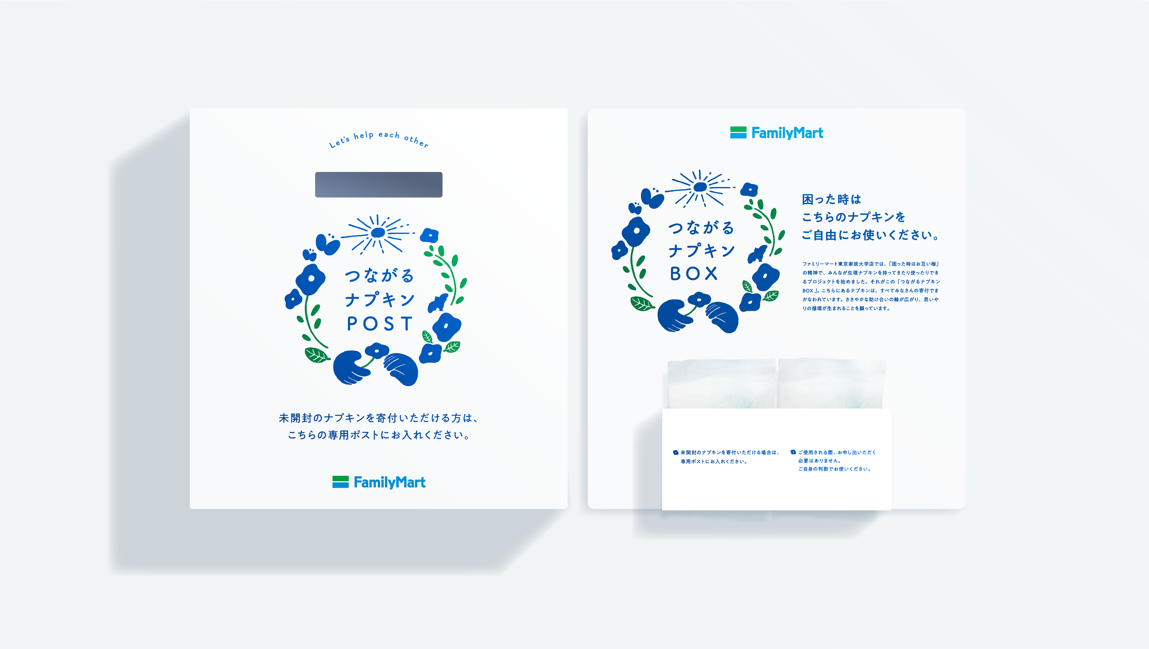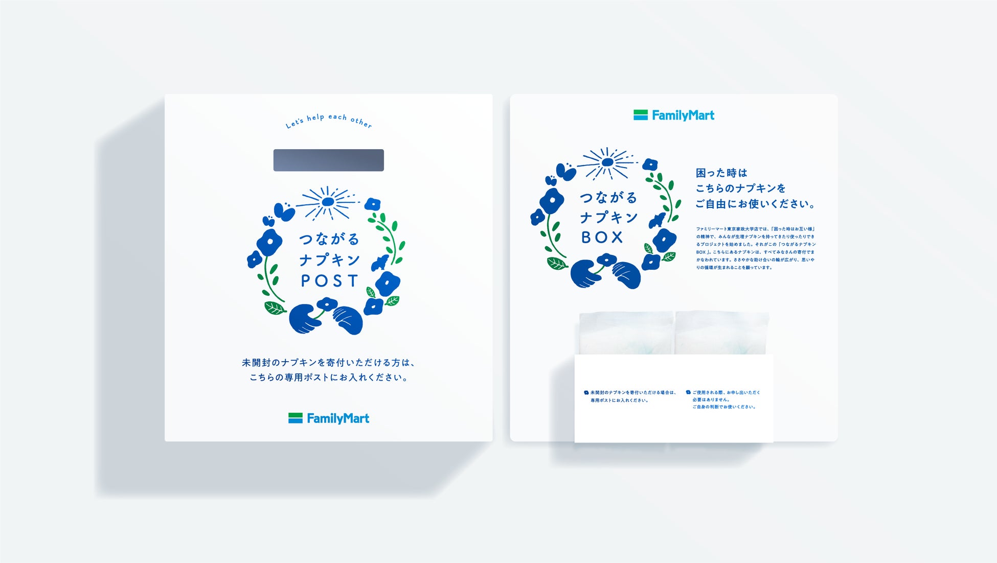 ファミリーマートでは、経済的な理由で生理用品を十分に入手できない「生理の貧困」が社会問題になっていることを受け、「つながるナプキンBOX」を東京家政大学店協力のもと、試験設置いたしました。設置店舗には、店舗を利用されるお客さまのみならず、昨年のニュースでこの取り組みを知ったという近隣の方からも多くのご寄付をいただき、学生の方からは「急な生理で助かりました」「できればこのまま継続してください」などの声が寄せられ、設置店舗からは「学生を支援できる、いつでも気軽に立ち寄れる場所を提供したい」との想いをいただきました。