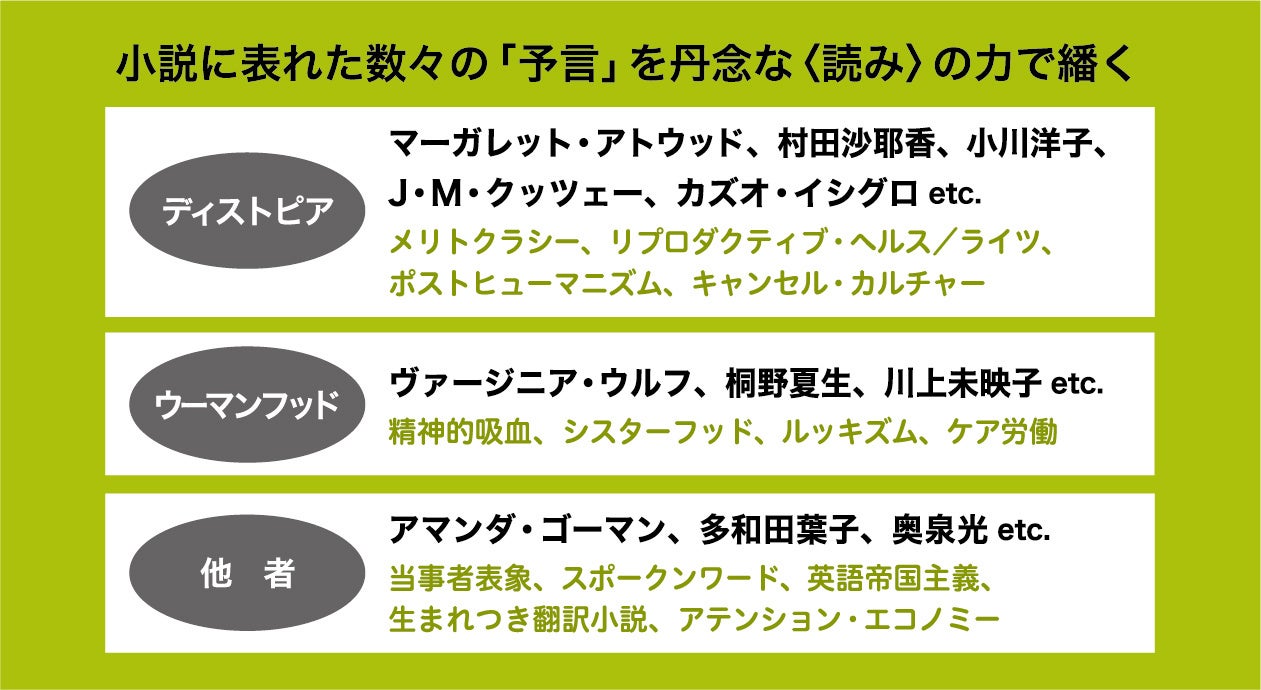 社会の分断、パンデミック、戦争……わたしたちの予想や予測をつぎつぎと越える現実世界の展開に、文学のほうがリアルに追い抜かれそうな印象すらあるかもしれません。しかし文学にはいつも、いま起きていることはすでに書かれていました。文学ははるか以前に「予言」していたのです。ディストピア小説にかぎらず、すべての小説は、すでに起きていながら多くの人の目に見えていないことを、時空をずらして可視化する装置です。本書をお手に取っていただければ、そのことをきっと実感していただけると思います。