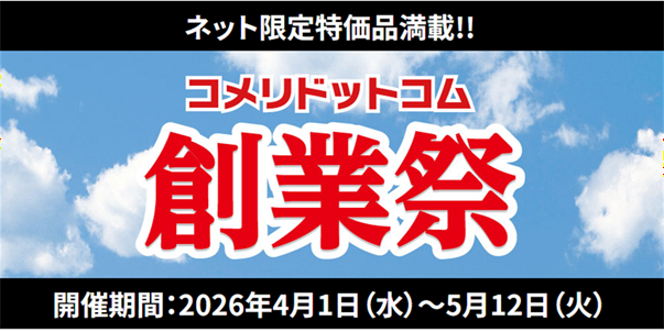 ホームセンターの「コメリパワー」や「コメリハード&グリーン」を通し地域のライフラインであり続けたいと願う株式会社コメリ(所在地:新潟県 新潟市、代表取締役社長:捧 雄一郎)は、2026年4月1日(水)より、オンラインショッピングサイト「コメリドットコム」にて「コメリドットコム創業祭」を開始いたします(一部店舗を除く)。