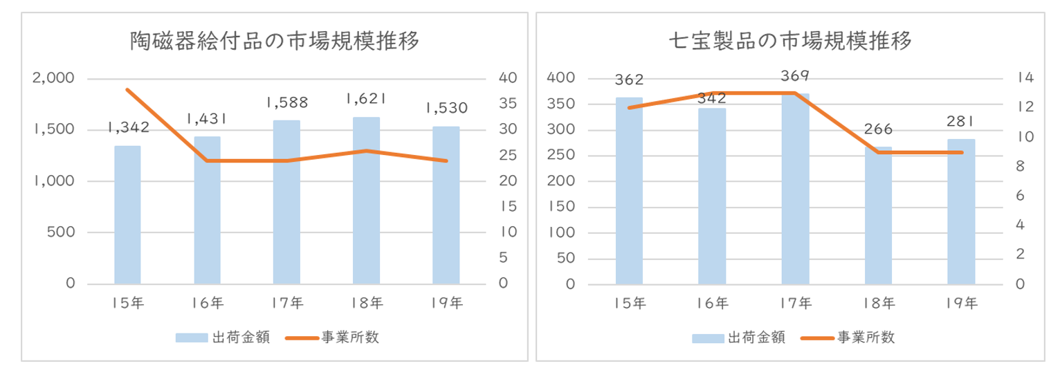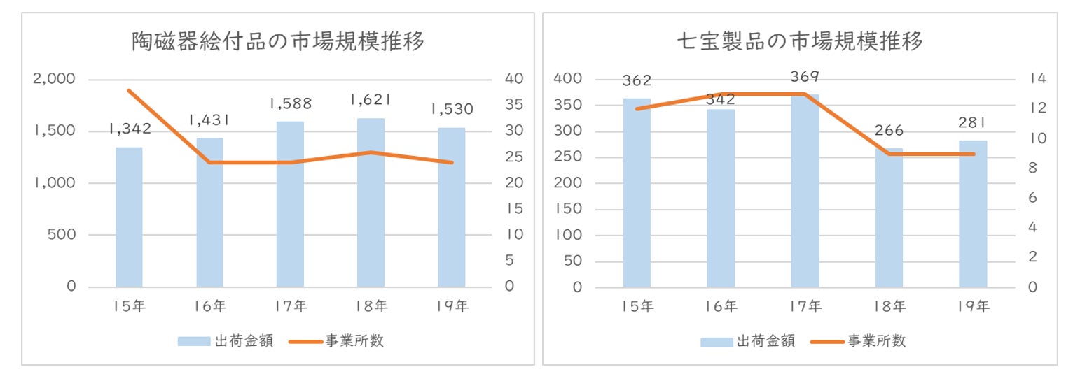 経済産業省が実施している直近の2020年「工業統計調査」(2019年実績)における品目別統計表より伝統工芸品企業が多く含まれる市場について見ていくと、ほとんどの品目で出荷金額が減少し、事業所数も減少傾向にあることが分かります。(図1)これらの数字は2019年実績であり、国内においてはインバウンドの市場が拡大し言わば追い風を受けていたタイミングの統計ですので、コロナ禍でインバウンドが停滞し、激しく失速した現状はさらに厳しい状況にあることが推察されます。