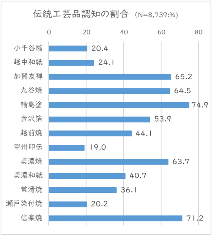 今回の調査からみると、日本の伝統工芸品は国内においてもまだ2~3割の認知にとどまっているものが多く、まずは地域外の方々に知っていただくということが活性化の入り口となりそうです。