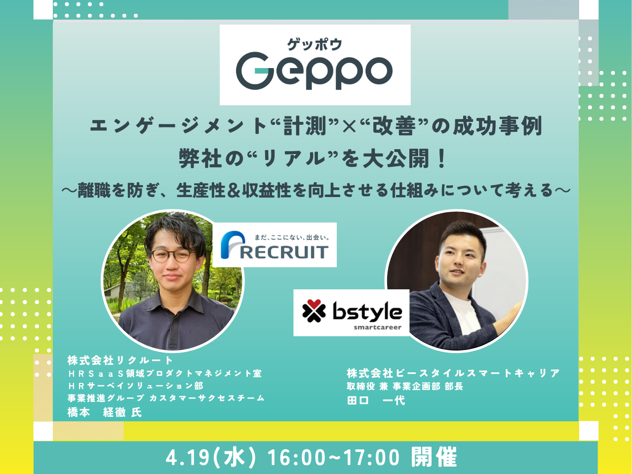 前半は、サーベイツール『Geppo』を提供するリクルートの橋本氏よりエンゲージメントを計測する重要性や高める方法を、後半は、実際に『Geppo』を導入しているビースタイル スマートキャリア 取締役の田口よりサーベイ回答率9割以上を保つ秘訣や、エンゲージメント向上に繋がった実際の施策などをご紹介いたします。